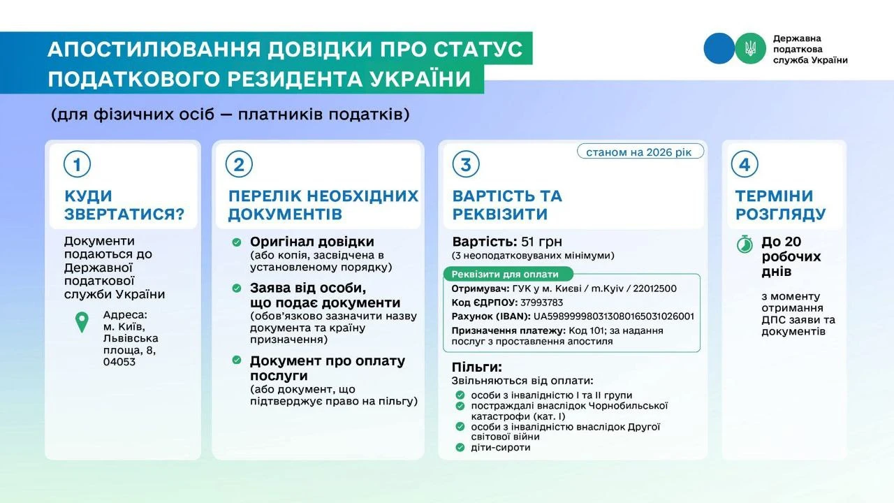 Для апостилювання довідки про статус податкового резидента України необхідно звернутися до Державної податкової служби України (Львівська площа, 8, м. Київ, 04053).